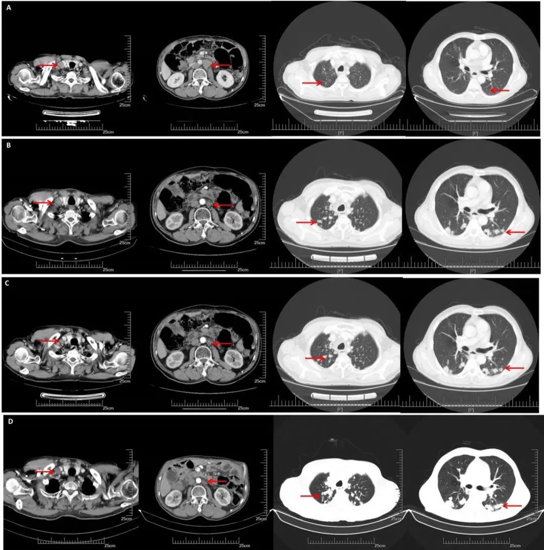 A:CT增强(2018.11.07): 腹膜后多发淋巴结转移,部分较前增大。双侧锁骨上淋巴结转移,部分较前增大,双肺多发结节,转移可能;B:CT增强(2019.05.16):腹膜后淋巴结较前缩小,双肺转移较前增多增大;C:CT增强(2019.10.25):腹膜后淋巴结稳定,双肺转移较前增多增大;D:CT增强(2020.05.27):双肺转移瘤及腹腔淋巴结总体稳定。