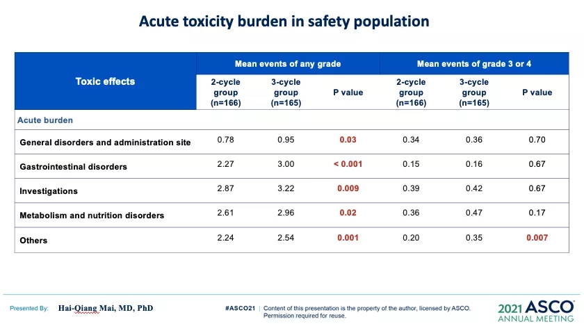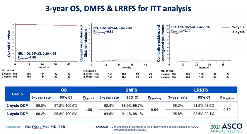 该研究在EBV DNA水平<4000 copies/ml的局部晚期鼻咽癌患者中检验了2个周期对比3个周期的同步顺铂化疗的非劣效性。主要终点为3年无进展生存期(PFS),非劣效界值为10%。共入组332例患者,随机分配接受2或3个周期的顺铂治疗。在中位随访37.7个月后,在2周期组和3周期组,发生肿瘤进展的患者分别有20例(12.0%)和17例(10.2%);3年PFS率分别为88.0%和90.4%,差异为2.4%(95%CI:-4.3~9.1;非劣效性P=0.014)。符合方案集分析(per-protocol analysis)显示,2周期组和3周期组的PFS率分别为88.5%和90.6%,差异为2.1%(95%CI:-4.6~8.8;非劣效性P=0.013)。无局部区域复发生存率(LRRFS)和无远处转移生存期(DMFS)无显著性差异。3周期组患者的低钠血症发生率明显更高。此外,3周期组患者出现1~2级口干、吞咽困难、体重减轻、乏力、便秘、发热、黏膜炎、皮炎的发生率,出现3-4级黏膜炎和皮炎的发生率也明显更高。