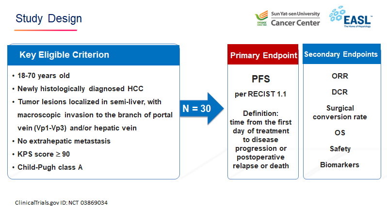 2021年6月23~26日,全球肝脏病学领域最具影响力的欧洲肝脏研究协会(EASL)年会—国际肝病大会(ILC 2021)以线上会议的形式举行。本次会议上,中山大学肿瘤防治中心肝脏外科的徐立教授代表陈敏山教授团队口头报告了该中心一项研究者发起的Ⅱ期研究的初步结果。该研究将肝动脉灌注化疗(HAIC)联合PD-1抑制剂信迪利单抗治疗用于局部晚期、潜在可切除肝细胞癌(HCC)的转化治疗,显示出令人鼓舞的疗效,有望为局部晚期HCC患者提供更多治愈机会。作为首个在国际大会上口头汇报的晚期肝癌转化治疗的前瞻性研究,也是本次ILC大会肝癌领域唯一进行口头报告的中国团队,该研究引起了广泛关注,还受主办方EASL邀请参加了本次大会的新闻发布会,专门对研究内容进行重点推介。