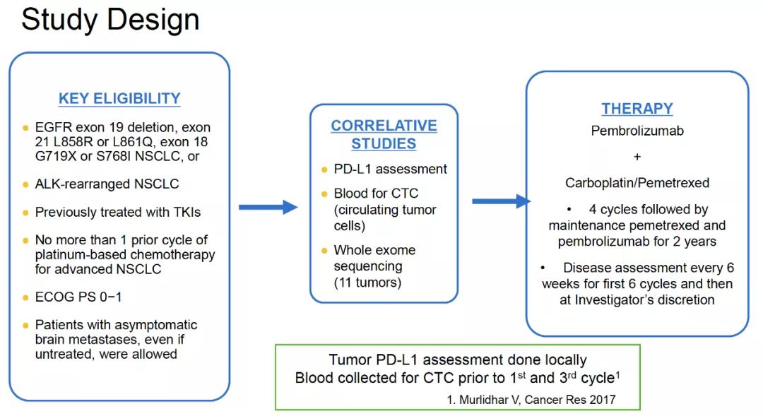 今年WCLC一项单臂II期多中心临床研究分析了帕博利珠单抗联合化疗用于后线治疗靶向耐药的EGFR+/ALK+晚期NSCLC的疗效及安全性。采用卡铂(AUC 5)+培美曲塞(500mg/m2)联合帕博利珠单抗200mg治疗,每三周一次,4周后接受培美曲塞联合帕博利珠单抗维持治疗,治疗上限为2年。主要研究终点为研究者评估的应答率(RR),次要研究终点为无进展生存(PFS)及总生存(OS)。