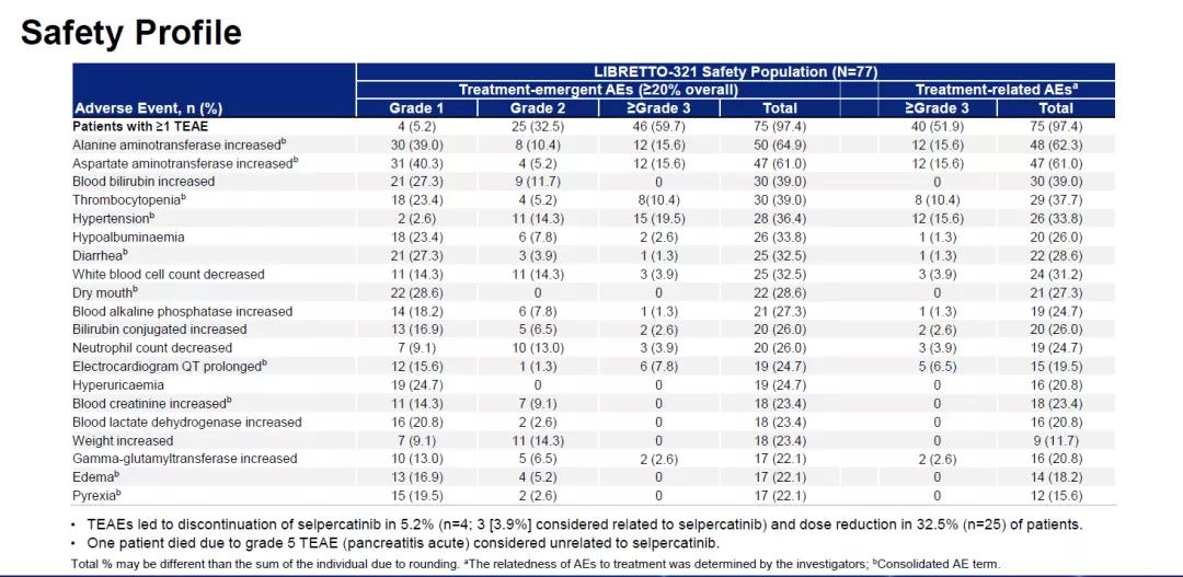 在所有47例NSCLC患者中,ORR为66.0%,11例初治患者的ORR达到90.9%,36例经治患者为58.3%。中位TTR为1.8个月,中位DOR未达到,96.8%的患者仍保持应答(中位随访10.3个月)。在安全性方面,Selpercatinib总体耐受性良好,大多数AE可控且可逆,最常见的≥3级TRAEs是丙氨酸转氨酶水平升高(15.6%)、天冬氨酸转氨酶增加(15.6%)、高血压(15.6%)等。3.9%(n=3)的患者因TRAE停药,32.5%的患者需要减量。(见图6)