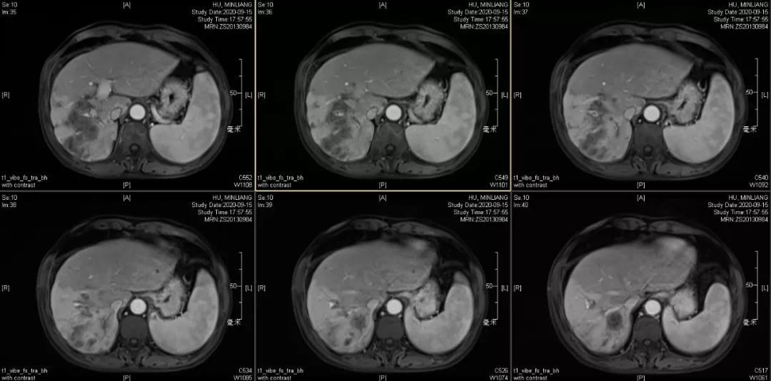 肿瘤学评估(用药后2个月对比6个月):肝内主瘤明显缩小,动脉期强化降低;子灶消失;门脉右支癌栓明显缩小坏死;肺转移灶缩小,大部分消失。