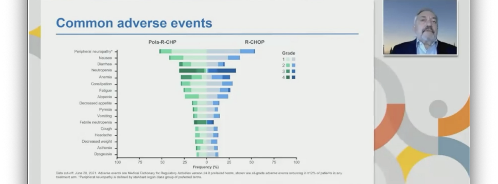 该项研究的核心就是对照R-CHOP标准治疗,联合一个新的药物 “Pola”。Pola是一种新兴的抗体偶联药物(antibody-drug conjugate,ADC),在2019年欧美批了用于复发难治性DLBCL的治疗。它兼具了免疫治疗和化疗药物两方面的作用:它的免疫治疗靶点——CD79b,它在B细胞肿瘤表达率达96%以上,因此Pola的靶向作用更加“精准”,可作为绝大多数B细胞肿瘤患者的一个治疗选择。其次,偶联的甲基澳瑞他汀(MMAE)为一种抗微管药物,通过抗体结合下的精准定位,可直达肿瘤细胞,因此对于淋巴瘤的“杀伤力”较其他的纯免疫治疗、小分子的靶向药物的靶向性更强。Pola在2线、3线的治疗当中已经得到证实,也获得了批准,能否在一线治疗当中获得成功我们比较关注。