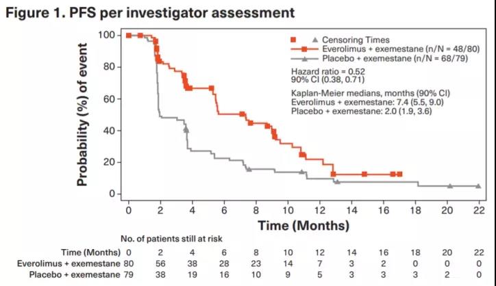 2021年8月发表于JAMA oncology上的由徐兵河教授牵头的Ⅱ期MIRACLE研究结果证实依维莫司对内分泌耐药的绝经前HR+/HER2-乳腺癌患者仍然有效。在ITT人群中,依维莫司组和内分泌治疗组的PFS分别为19.4个月(95%CI:16.3~22.0个月)和12.9个月(95%CI:7.6~15.7个月),依维莫司治疗可显著降低36%的疾病进展和死亡风险(HR=0.64,95%CI:0.46~0.89,P=0.008)。
