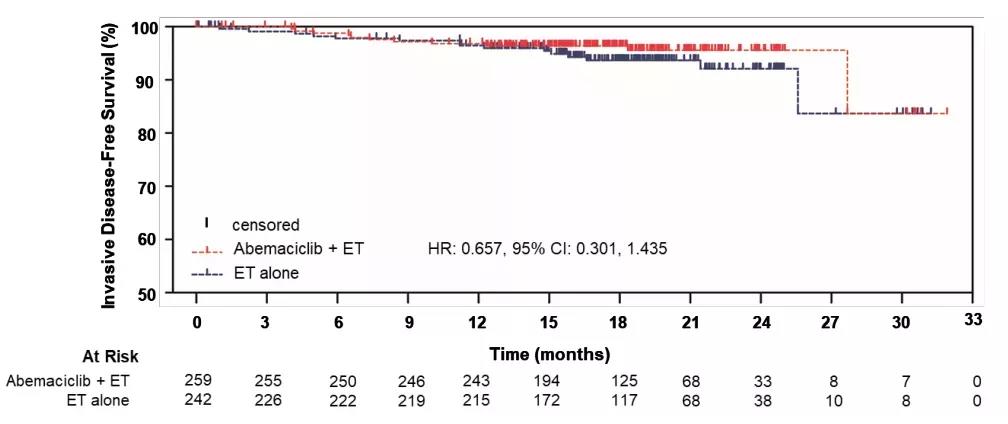 Ⅲ期monarchE研究首次证实了abemaciclib+ET辅助治疗可显著提高HR+/HER2-早期高复发风险乳腺癌患者的生存。2021 ASCO大会上中国亚组患者的数据公布,结果显示,与单独ET相比,abemaciclib+ET使中国患者发生浸润性疾病或死亡的风险降低了34.3%(HR=0.657,95%CI:0.301~1.435),2年iDFS率也达到了具有临床意义的改善,绝对获益3.5%(95.6% vs. 92.1%),与之前报告的全球人群数据结果一致。