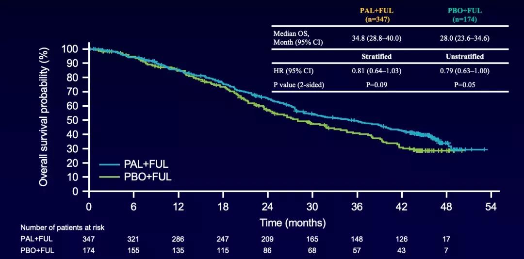 2021年ASCO大会公布的PALOMA-3研究OS的更新结果显示,中位随访时间73.3个月,哌柏西利+氟维司群的生存获益持续,两组的OS分别为34.8个月vs. 28.0个月(HR=0.81,P=0.0221),降低了19%死亡风险;哌柏西利+氟维司群组5年OS率为23.3%(95%CI,18.7~28.2),而安慰剂组的5年OS率为16.8%(95%CI:11.2~23.3);两组的安全性尚可。