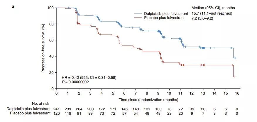 2021年ASCO大会上徐兵河教授公布了由其主导的,我国自主研发的CDK4/6抑制剂达尔西利(Dalpiciclib)+氟维司群对比安慰剂+氟维司群治疗既往内分泌治疗复发的HR+/HER2-转移性乳腺癌患者DAWNA-1研究的结果,显示在二线治疗中,国产原研的Dalpiciclib+氟维司群用于二线治疗也可显著改善患者PFS(15.7 vs. 7.2个月,HR=0.42),达尔西利组的进展或死亡风险降低58%(HR= 0.42,95%CI:0.31~0.58,P=0.00000002),期待我国自主研发的CDK4/6抑制剂早日上市。