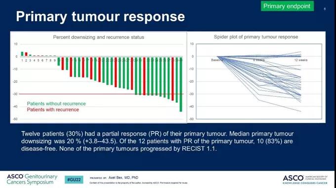 免疫联合靶向药物对于晚期肾透明细胞癌患者取得较高的客观缓解率,因此前移至术前开展新辅助治疗也是目前研究的热点,本次ASCO-GU大会报道了第一个靶免联合新辅助治疗的NeoAvAx研究,这是一项Avelumab联合阿昔替尼用于高危非转移性肾透明细胞癌的II期研究,主要入组患者的分期为临床分期为T1b-T2a且G4、T2b-T3a且G3-4、T3b-T4任意分级以及任意T合并淋巴结转移,术前12周接受阿昔替尼联合Avelumab治疗,研究的主要重点是超过25%的客观有效率,次要终点是DFS,OS和安全性,探索性终点为生物标志物分析。