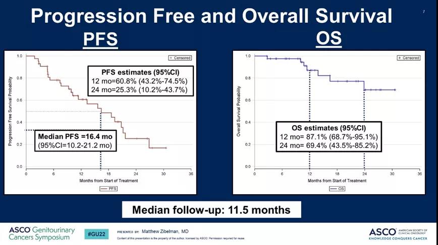对于获批晚期肾癌免疫治疗适应症的纳武利尤单抗,以及作为免疫联合最多的靶向药物阿昔替尼,尚未见这两个药物联合给药的数据,本次大会报道了阿昔替尼联合纳武单抗一线治疗晚期肾透明细胞癌的I/II期研究数据。研究入组44例患者,IMDC低中高危分别占40.9%,52.3%和6.8%,中位随访11.5月,疾病控制率为97.6%,客观有效率为59.5%(CR 2.4%),中位PFS为16.4月,12月OS率为86.7%,中位OS未达到。3级及以上不良反应发生率为70.7%,14%的患者因为不良反应停药。该研究显示,阿昔替尼联合纳武单抗显示出与其他以批准免疫联合方案相似的安全性和有效性。阿昔替尼一如既往的显示出与其他抗PD-1药物联合的安全性。