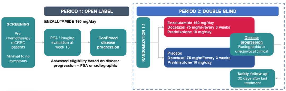 2022年ASCO大会口头报告环节报道的PRESIDE研究提供了一种新的模式:在恩扎卢胺一线治疗进展后,二线治疗继续保留恩扎卢胺并联合化疗。该研究入组了687例未接受过化疗的mCRPC患者,第一阶段(P1)给予恩扎卢胺单药治疗;发生进展的患者进入第二阶段(P2),随机分为恩扎卢胺+化疗组或安慰剂+化疗组,主要终点是P2阶段的无进展生存期(PFS),次要终点为至PSA进展时间(TTPP)、PSA缓解率等。