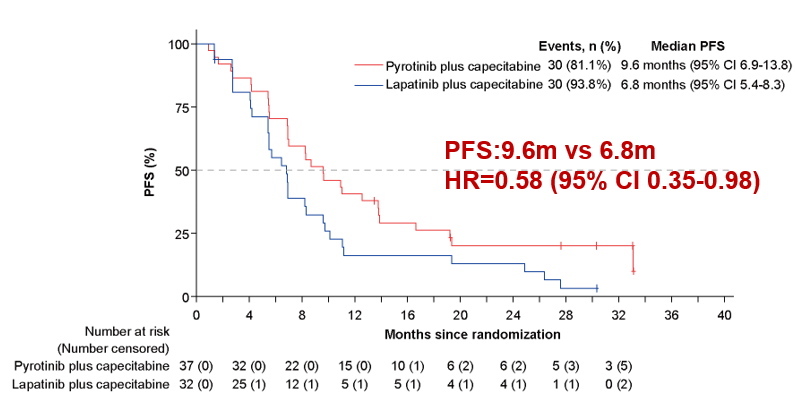 在PHOEBE研究入组的267例患者中,包含69例曲妥原发耐药的患者,试验组30例,对照组37例。根据进一步随访的主要终点PFS的亚组分析,无论曲妥是否耐药,都能观察到患者可以从吡咯替尼联合卡培他滨的治疗中获益的趋势。曲妥耐药人群,吡咯替尼组中位PFS为9.6个月,对比拉帕替尼组6.8个月,HR值为0.58(95% CI 0.35-0.98),PFS获益趋势明显,9.6个月无进展生存,单从数值上来看是目前在原发耐药这一群体中报道的最佳结果。