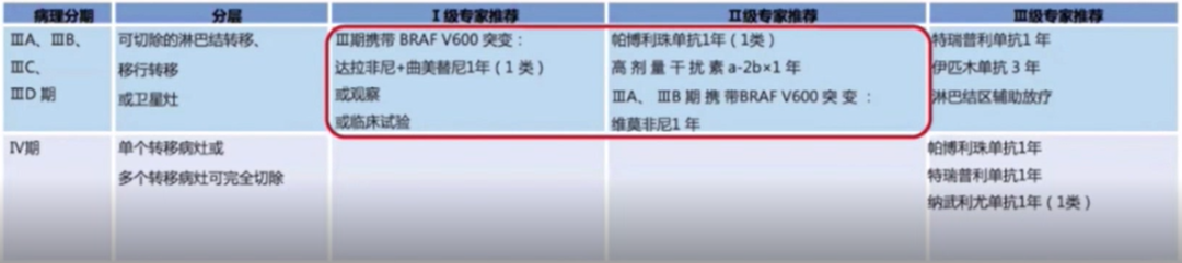 对于III期携带BRAF V600突变的患者,I级推荐达拉非尼+曲美替尼(1类),或观察,或参加临床试验;III期患者II级推荐帕博利珠单抗1年,或高剂量干扰素a-2b×1年;而IIIA、IIIB期携带BRAF V600突变的患者可II级推荐维莫非尼1年。
