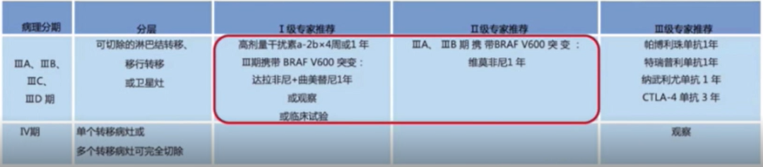 IIB、IIC期患者可I级推荐高剂量干扰素a-2b×4周或1年或临床试验;IIC期携带BRAF V600突变的患者可II级推荐维莫非尼1年;III期患者可I级推荐高剂量干扰素a-2b×4周或1年;
