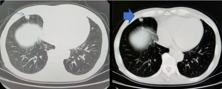 随诊:2021年1月3日胸部CT:右中肺结节增大,考虑转移。