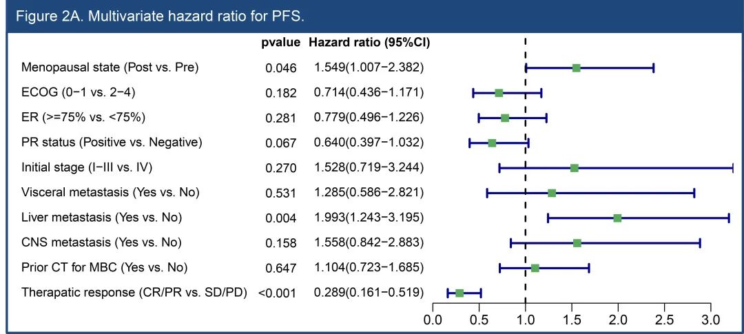 肿瘤反应为CR/PR是PFS的独立保护性因素(HR=0.289, [95%CI, 0.161-0.519], p<0.001);