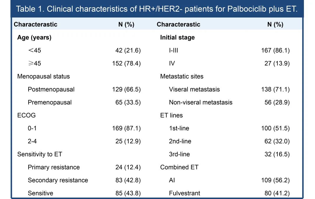 2018年5月至2020年12月研究共入组194例患者纳入分析(表1),其中绝经前患者65例(33.5%),绝经后患者129例(66.5%)。大多数患者合并内脏转移(138例,71.1%)。接受一线、二线、多线内分泌治疗的患者分别为100 例(51.5%)、62例(32.0%)和32例(16.5%)。109例患者联合AI治疗(56.2%),80例患者联合氟维司群治疗(41.2%)。