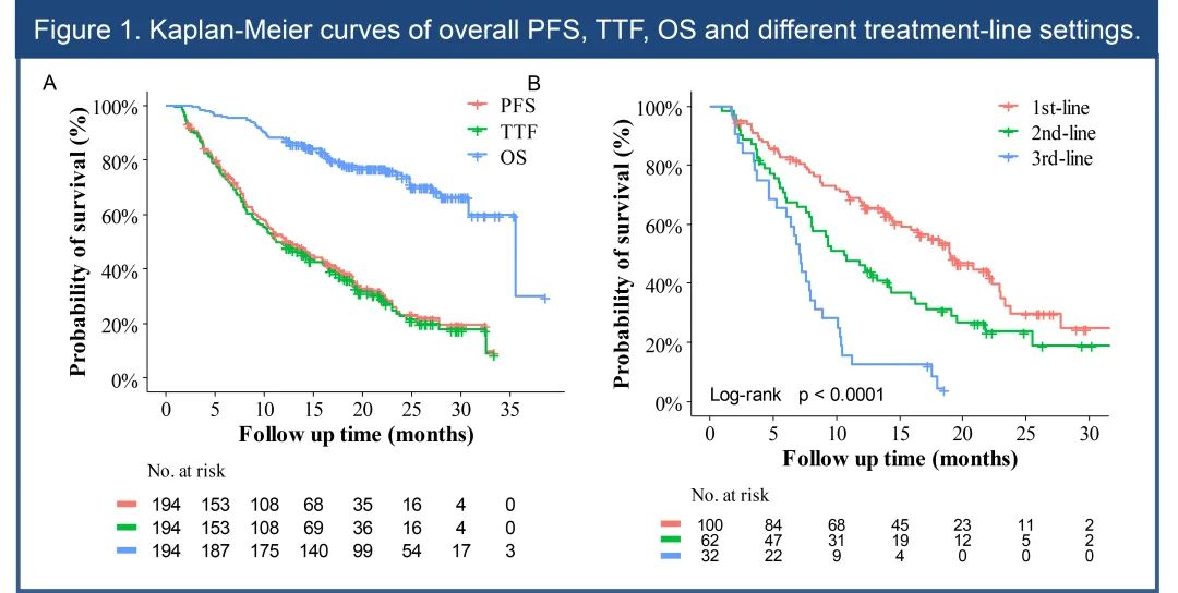截至观察终点,中位随访时间为22.4个月,共138例患者退出哌柏西利联合内分泌治疗,退出原因包括疾病进展(130例)、经济无法承担(5例)、不良反应无法耐受(4例)。总体人群中位PFS为12.3月,中位TTF为11.8月,中位OS为35.5月(图1A)。1年PFS率、TTF率、OS率分别为50.8%、49.0% 和87.6%。一线内分泌治疗展示出相较于二线、三线及以上更长的PFS获益(p<0.001,图1B)。在具有可测量病灶的155例患者中,客观缓解率ORR为27.1%、临床获益率CBR为71.6%,疾病控制率DCR为81.3%