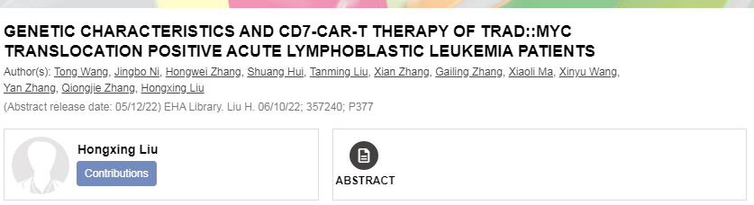 编者按:2022年6月9~17日,第27届欧洲血液学年会(EHA)正在奥地利维也纳“如火如荼”地开展中,作为一年一度的血液学领域的学术盛会,EHA会议代表了血液病治疗和研究动态的最前沿,而CAR-T是近十年来掀起来的研究热潮,有望带来肿瘤治疗的又一次“革命”。陆道培医院王彤教授和刘红星教授的一项研究(P377)入选了EHA,旨在研究重现性t(8;14)(q24.1;q11.2)/TRA/D::MYC融合基因对CD7 CAR-T治疗及异基因造血干细胞移植疗效的影响,《肿瘤瞭望》特邀王彤教授详细介绍本研究并进行深入解读,以供读者参考。