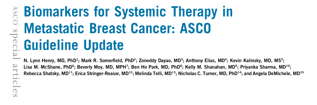 Henry NL, Somerfield MR, Dayao Z, et al. Biomarkers for Systemic Therapy in Metastatic Breast Cancer: ASCO Guideline Update [published online ahead of print, 2022 Jun 27]. J Clin Oncol. 2022;JCO2201063. doi:10.1200/JCO.22.01063
