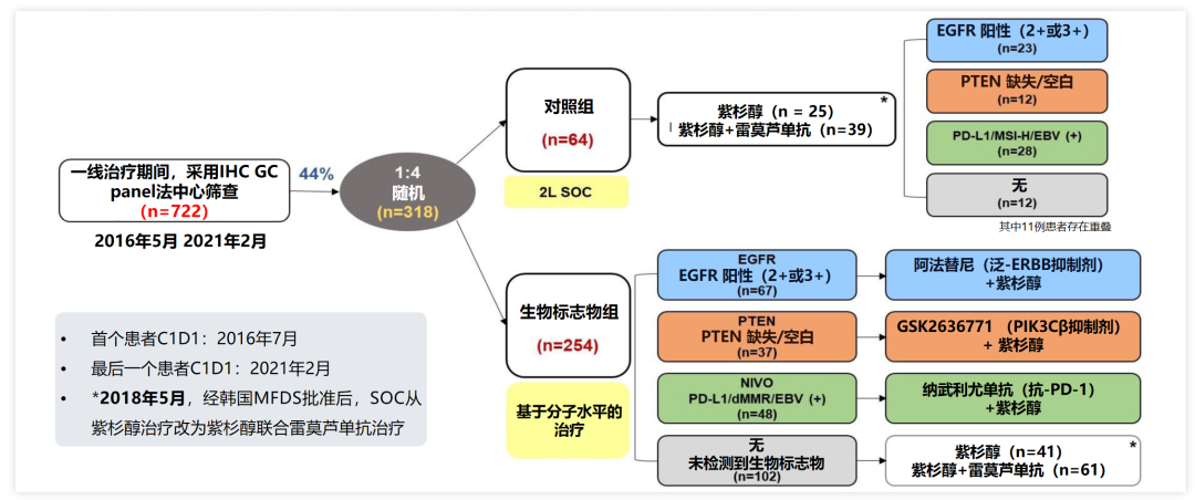 这项来自韩国的新型伞式研究,采用IHC GC panle来筛查生物标志物。318例患者按照1:4的比例随机分为对照组和生物标志物组。对照组采用标准二线治疗(即紫衫或紫衫+雷莫芦单抗)。生物标志物组中,EGFR阳性(2+或3+)患者采用泛-ERBB抑制剂阿法替尼+紫杉醇治疗;PTEN缺失患者采用PIK3Cβ抑制剂+紫杉醇治疗;PD-L1+/dMMR/MSI-H/EBV+等免疫标志物阳性的患者采用纳武利尤单抗+紫杉醇治疗;而没有检测到上述生物标志物的患者则接受标准治疗。