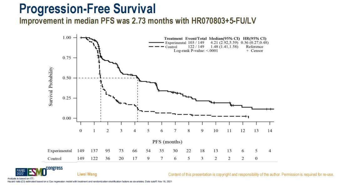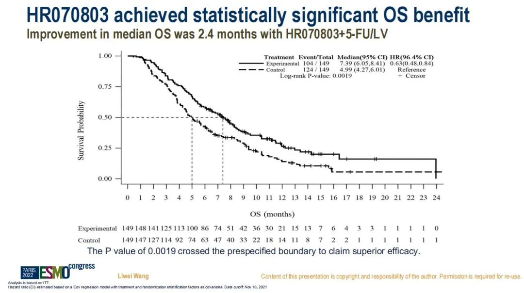 本研究自2018年1月至2021年5月共纳入了298例一线吉西他滨治疗失败的局部晚期或晚期胰腺癌患者,研究1:1随机入组,分别接受 HR070803+5-FU/LV方案或安慰剂+5-FU/LV 方案治疗,直至疾病进展或不耐受。主要研究终点为总生存期(OS),次要研究终点包括无进展生存期(PFS)、客观缓解率(ORR)、安全性等。中位随访时间为12.81个月,OS 数据分析截止至2021年11月18日。