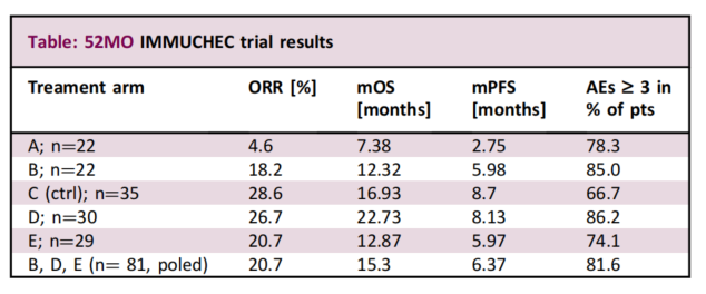 IMMUCHEC研究是一个多臂的一线胆道癌的小规模的随机对照研究,研究的主要目的是探索PD-L1 抑制剂durvalumab (D)和CTLA-4 抑制剂tremelimumab (T)联合吉西他滨和顺铂(GC)的疗效,和吉西他滨和顺铂经典的治疗做了一个简单的对比。这是在德国做的很有意思的一个proof-of-concept 研究,有点像K药和信达头对头的小规模随机对照研究。