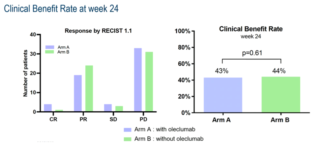 数据截止日期2022年7月4日,中位随访时间13.2个月,A组和B组24周CBR分别为43%和44%(单侧Fisher’s exact,P=0.61),根据PD-L1或CD73不同表达水平的24周CBR亚组分析结果也没有看到显著统计学差异。