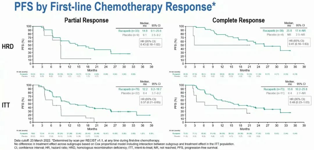 根据影像学评估的一线化疗缓解情况进行分层,评估患者的PFS。对于获得PR的患者,HRD人群使用rucaparib和安慰剂治疗的中位PFS分别为14.8个月(95% CI: 9.1-25.6)和9.1个月(95% CI: 3.5-9.2)(HR=0.43; 95%CI: 0.18-1.02)。获得PR的ITT人群的中位PFS分别为12.2个月(95% CI: 9.2-19.7)和6.4个月(95% CI: 3.7-9.2)(HR=0.37; 95% CI: 0.21-0.65)。