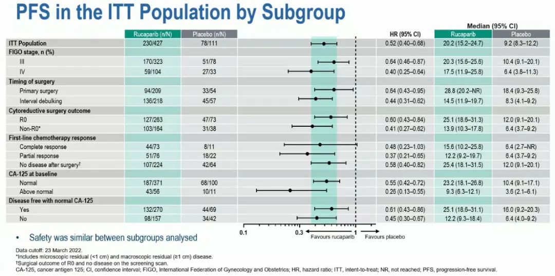 根据外科医生评估的手术结果进行分层,评估患者的PFS。在R0手术切除且存在HRD的患者中,使用rucaparib和安慰剂治疗的中位PFS分别为未达到(NR; 95% CI: 28.7-NR)和22.1个月(95% CI: 9.2-NR)(HR=0.52; 95% CI: 0.30-0.92)。在达到R0切除的意向治疗(ITT)人群中,中位PFS分别为25.1个月(95% CI: 18.6-31.3)和12.0个月(95% CI: 9.1-20.1)(HR=0.60; 95%CI: 0.43-0.84)。
