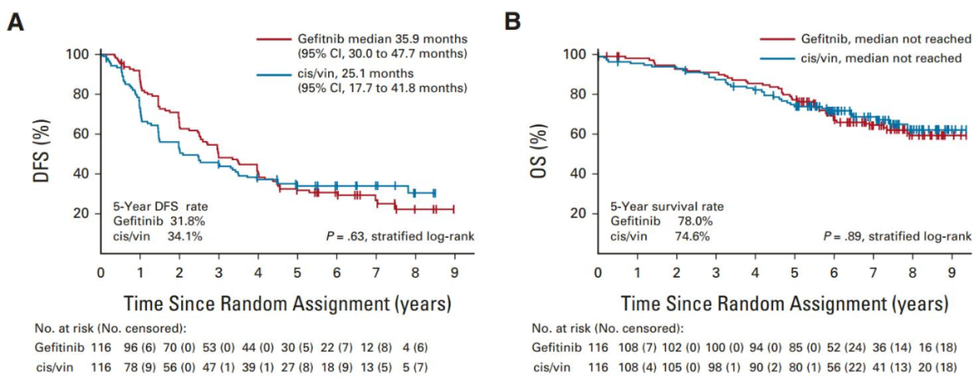 ADJUVANT研究分析了术后辅助吉非替尼治疗与标准化疗的疗效及安全性,研究纳入了携带EGFR敏感突变且有淋巴结转移的患者,共计222例患者随机化。两组中位DFS分别为28.7个月和18.0个月,HR=0.6。但是,这一DFS的获益并未转化为OS的获益。更新后的OS数据发现,靶向治疗组和化疗组的中位OS分别为75.5个月和62.8个月,差异无统计学意义,HR=0.92,P=0.674。5年OS率分别为53.2%和51.2%,P=0.784。重要的亚组分析中,基于淋巴结转移同样未能发现获益人群,OS中,N1和N2的患者HR分别为0.97和0.92。