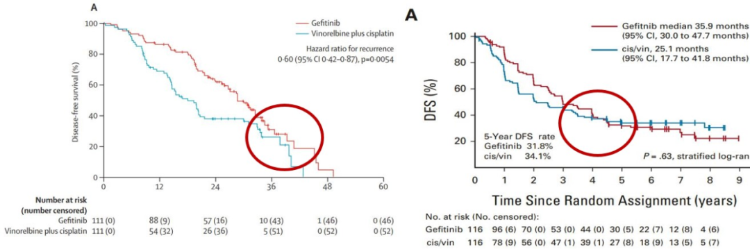早在2002年,将吉非替尼应用于术后辅助治疗领域的III期临床研究——BR19研究就已经开启。但前503例患者入组后,因无效性分析,研究被提前关闭,因为该研究并不基于突变对患者进行筛选。经过中位4.7年的随访后,并未发现吉非替尼术后辅助治疗可以改善患者的OS(HR=1.24)或DFS(HR=1.22)。4年后,第二个靶向辅助治疗的研究——RADIANT研究开启。虽然该研究已经有意识的筛选患者,但由于当时EGFR突变类型与一代EGFR-TKI疗效的关系尚不明确,因此,研究错误的以EGFR蛋白过表达和基因扩增(FISH方法检测)作为入组标准。最终,以失败告终。不过这个研究中,研究者将EGFR突变患者的DFS和OS设定为关键次要研究终点,共计161例(16.5%)患者,两组中位DFS分别为46.4个月和28.5个月(P=0.039),但未达到统计学显著性。