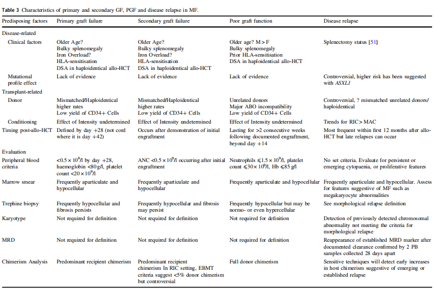 ?植入失败:植入失败(GF)可导致较高的发病率和死亡率,早期识别是关键。在最近的EBMT研究中,进展为GF的患者的5年生存率为14%。除了已知的供体、预处理和细胞剂量相关的导致Allo-HSCT植入失败(GF)风险因素之外,其他导致MF植入失败的风险因素还包括脾脏肿大,这是一种不良的骨髓”微环境“,可导致纤维化、慢性炎症、大量输血后的铁过载以及存在HLA抗体。值得注意的是,Keyzner等人发现,与HLA匹配的供体相比,使用HLA不匹配的供体进行Allo-HSCT的患者发生GF的风险更高(60%vs 13%,P=0.04),而骨髓纤维化程度和脾肿大基线水平并不影响植入失败(GF)率。根据目前EBMT对GF的定义,可以将GF分为原发性GF和继发性GF,原发性GF是指造血干细胞输注28天后中性粒计数(ANC)仍<0.5×109/L、血红蛋白(HB)<80g/L及血小板计数(PLT)<20×109/L;继发性GF则是定义为ANC<0.5×109/L,发生于初次植入后,与复发、感染或药物毒性无关。