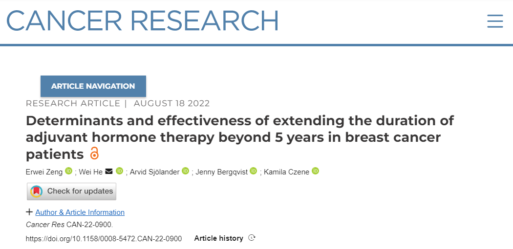 本项基于人群的研究使用了几个瑞典健康登记处的数据库,前瞻性地跟踪了2005年到2020年间13168名乳腺癌患者,并将他们分为延长辅助内分泌治疗组和不延长辅助内分泌治疗组。通过Cox回归分析来探究延长治疗是否与乳腺癌结局相关。