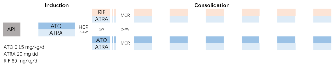 本研究的治疗方案全程无化疗,通过更积极使用羟基脲来降低高白细胞瘀滞的风险(WBC>4×109/L时使用)。同时,巩固期ATRA与砷剂均同时给药,不仅缩短疗程,且可能加强二者对白血病干细胞的协同清除作用。本研究中,口服砷剂治疗的不良反应均轻微可耐受,RIF联合ATRA的方案有利于中低危APL家庭治疗的推广,减轻疾病负担,减少住院率和住院时长。本研究仍在进行中。