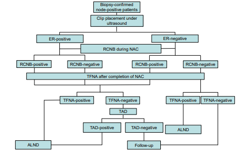 基于以上结果,我们提出了一种基于RCNB和TFNA的个体化评估流程:首先对TFNA结果阳性的患者常规进行腋窝淋巴结清扫(ALND),其次RCNB和TFNA均为阴性的ER阴性患者可以尝试豁免腋窝外科手术,最终在剩余患者中,可以进行创伤性更小的腋窝手术,如靶向腋窝清扫(TAD)(图3)。如果将该评估流程应用于本研究人群中,可以避免28.7%(25/87)的患者进行不必要的TAD尝试及2.3%(2/87)的TAD假阴性病例,并可能使11.5%(10/87)的患者成功豁免外科手术。