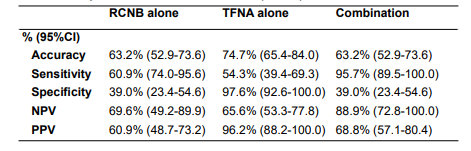 RCNB和TFNA联合使用,FNR为4.3%(95%CI:0%~10.5%),阴性预测值为88.9%(95%CI:72.8%~100.0%)(N=87,图2)。