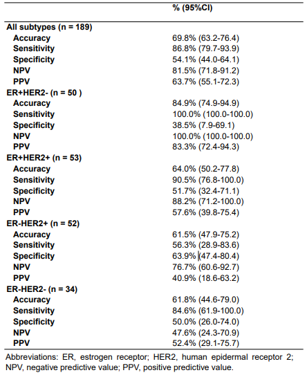 图1.重复空芯针穿刺活检在整个研究队列中预测腋窝淋巴结病理缓解状态的准确性