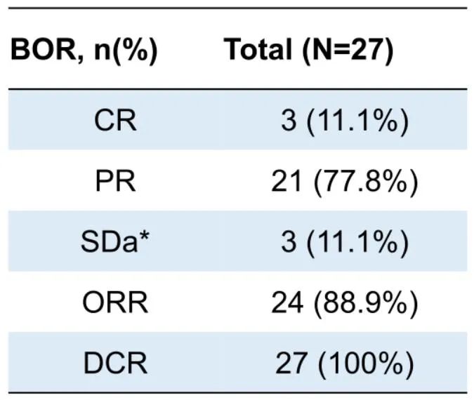 根据RECIST1.1,24例(88.9%)患者对新辅助治疗达到客观缓解,其中CR患者3例(11.1%),PR患者24例(77.8%),见表2。另外3例患者有SDa,定义为肿瘤缩小,以基线直径总和为参考,目标病灶直径总和减少30%以下(图2)。