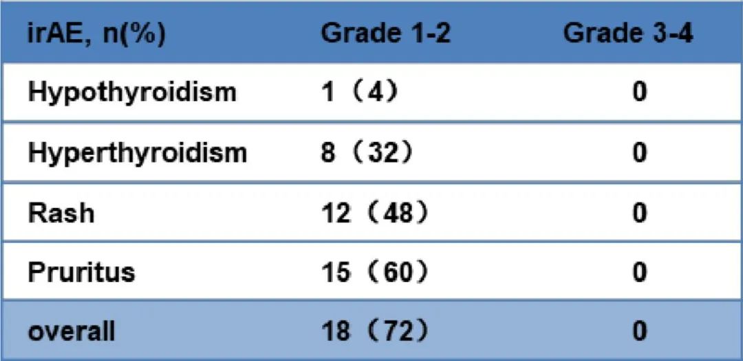 研究人员记录到18例患者发生1~2级免疫治疗相关不良事件(irAE)。无3~4级irAE发生,详见表3。