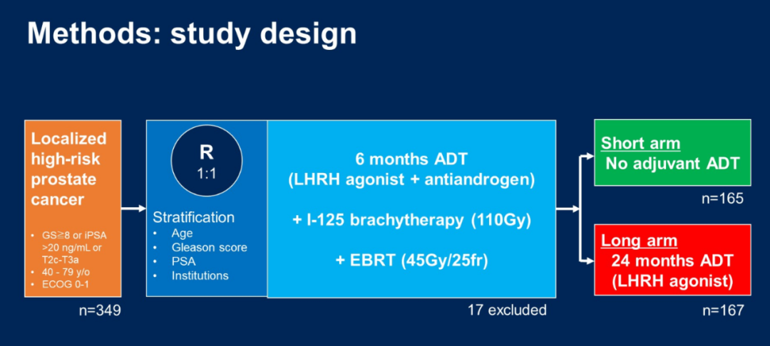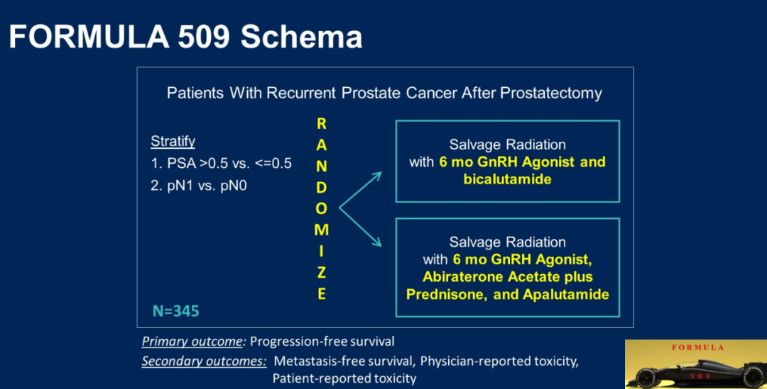 Nguyen教授:FORMULA-509研究是一项随机对照研究,入组了345例前列腺癌根治术后PSA升高(≥0.1 ng/ml),且有一个或多个高危因素(Gleason 8-10,PSA>0.5,pT3/T4,pN1或影像学N1,PSA倍增时间<10个月,切缘阴性,PSA持续不降,局部/区域病变较大,Decipher高危)的患者,在挽救性放疗(SBT)基础上接受6个月疗程的GnRHa+比卡鲁胺(标准组)或GnRHa+阿比特龙或阿帕鲁胺(试验组)。