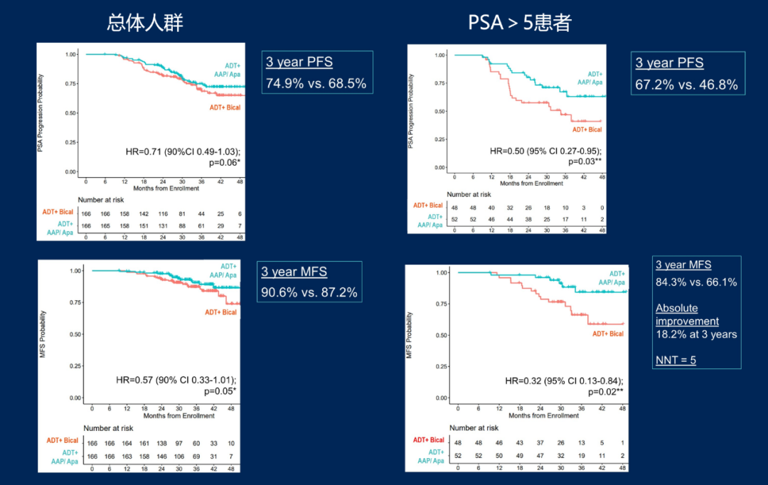 研究结果显示两组的主要终点无PSA进展生存期(PSA-PFS)接近于具有统计学意义的差异,风险比(HR)为0.71(90%CI:0.49~1.03),P值为0.06。因此,我们只是在单侧P值上没有达到显著性。然而,亚组分析显示PSA>0.5的患者中,其PFS(HR 0.50,95%CI:0.30~0.86,P=0.03)有显著获益。最重要的是,这个亚组患者的MFS风险比仅为0.32(95%CI:0.15~0.72),P值为0.02。阿比特龙和阿帕鲁胺治疗的3年MFS率绝对提高了18.2%,需治疗人数(NNT)为5,这意味着每治疗5例患者就可以避免1例发生转移。我们认为这是一个非常好的结果,特别是对于PSA>0.5的患者。