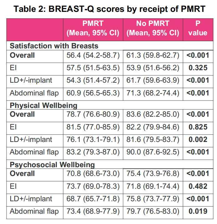 在术后12年的总体队列中,与未接受治疗的女性相比,IBR后接受PMRT的女性患者在三个关键BREAST-Q领域报告了有统计学意义和有临床意义的降低(表2)。然而,在接受不同类型IBR后接受/未接受PMRT的女性中比较BREAST-Q评分时,只有LD和AF亚组的患者有显著差异,EI组则无明显差异,这在“对乳房的满意程度”领域尤为明显。(表2、图1)
