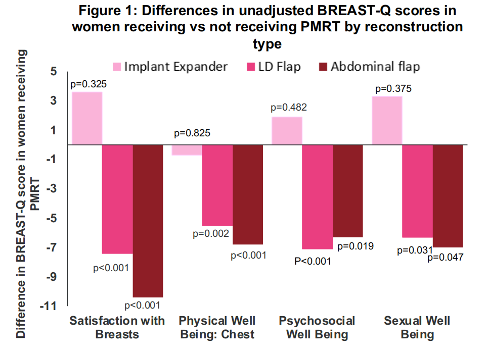 △图1.经重建接受PMRT与未接受PMRT的女性未经调整的BREAST-Q评分差异