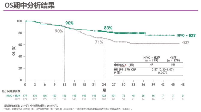 初步OS分析显示,与单独化疗相比,免疫联合组的OS有改善趋势,两年OS率在免疫联合组为83%,化疗组为71%,风险比为0.57(99.67%CI:0.30-1.07),两组的OS差异尚未跨越预定义的统计学显著性边界。廖永德教授指出,虽然这项研究的OS数据还不够成熟,但中期分析显示免疫联合组已经呈现获益的趋势。