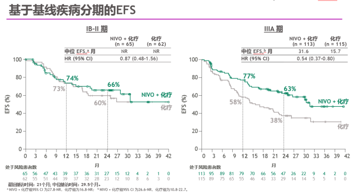 IB-II期患者中,免疫联合组和化疗组的中位EFS皆未达到(HR=0.87,95%CI:0.48-1.56),尚需更长时间的随访;IIIA期人群中的数据分别为31.6和15.7个月(HR=0.54,95%CI:0.37-0.80)。