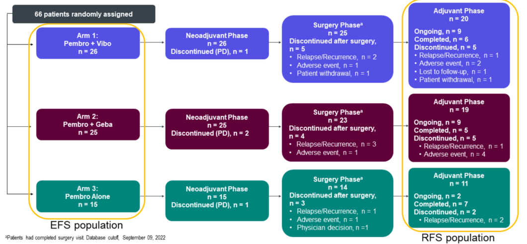 研究设计:这是一项Ⅱ期开放性临床研究,按照2:1随机分成联合组和K药单药组,如图所示,主要研究终点是无复发生存(RFS),次要研究终点是无远处转移生存(DMFS)、安全性和耐受性。