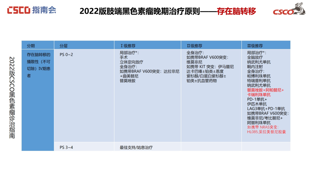 对于无脑转移的患者,“替莫唑胺+阿帕替尼+卡瑞利珠单抗”由原来的一线Ⅲ级推荐前移至Ⅱ级推荐,“如携带NRAS突变,建议采用妥拉美替尼胶囊(HL-085)治疗”由原来的二线Ⅲ级推荐前移至Ⅰ级推荐,Ⅱ级推荐新增“普特利单抗”;相同的更新也见于存在脑转移且PS评分0~2的患者。