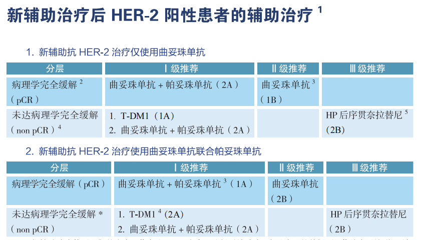 对于HER2阳性新辅助化疗之后的辅助治疗,2023版CSCO BC指南也进行了调整。既往我们认为新辅助化疗后未达pCR(non-pCR)患者,选用曲帕双靶进行辅助治疗是可行的。如今,随着T-DM1被纳入医保,可及性增强,对于术前抗HER2治疗仅使用曲妥珠单抗,且non-pCR的患者Ⅰ级推荐T-DM1证据由1B调整为1A;术前抗HER2治疗使用HP,且non-pCR的患者,Ⅰ级推荐T-DM1证据由1B调整为2A。