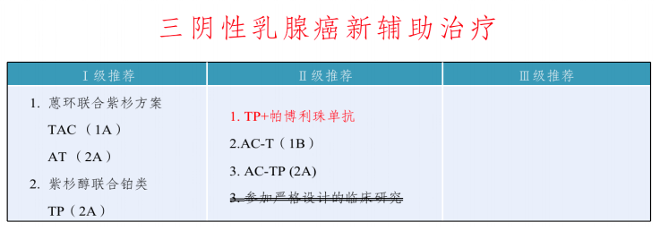 对于三阴性乳腺癌患者的新辅助治疗,2023版CSCO BC指南基于当前的循证医学证据也进行了更新调整。KEYNOTE 522研究提示,对三阴性乳腺癌患者,新辅助治疗时在TP-AC基础上增加帕博利珠单抗可以显著提高患者pCR率,术后继续使用帕博利珠单抗可以进一步改善患者的EFS。因此,基于KEYNOTE-522研究,帕博利珠单抗获NMPA批准适应症;在2023版CSCO BC指南Ⅱ级推荐中,也新增TP+帕博利珠单抗方案。