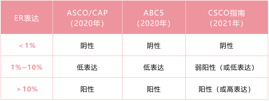 宋传贵教授:ER低表达(ER弱阳性)是指ER IHC介于1%~10%的肿瘤。在传统ER阳性的乳腺癌中,大约有为2%~5%为ER低表达[1];国内的小样本研究则提示ER低表达率为5%[2]。2005年国际乳腺癌研究小组首次提出内分泌治疗敏感、不敏感、不确定等三种类型,其中“不确定”型正是指ER低表达或不明确的肿瘤[3];直到2020年,ASCO/CAP才正式将ER乳腺癌分为ER阴性(<1%)、ER低表达(1%~10%)和ER阳性(>10%)[4]。尽管如此,临床上仍普遍将ER>1%作为内分泌治疗的界值(cut-off);但也有不少临床研究将ER>10%作为内分泌治疗的界值。